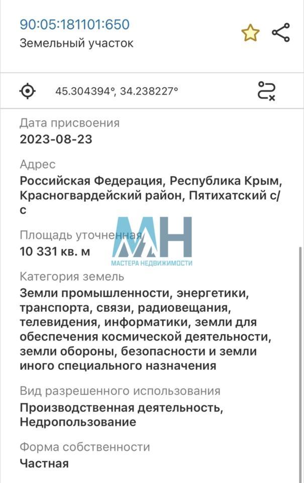 Продам участок 1ГА промышленного назначения. Собственность ! Адрес: Российская Федерация, Республика Крым, Красногвардейский район, Пятихатский с/с. Кадастровый номер: 90:05:181101:650 Категория земель: Земли промышленности, энергетики, транспорта, связи, радиовещания, телевидения, информатики, земли для обеспечения космической деятельности, земли обороны, безопасности и земли иного специального назначения. Вид разрешённого использования: Производственная деятельность Находится вблизи населённого пункта. Объект без комиссии. Полное сопровождение сделки под ключ. Если не дозвонитесь - пишите, обязательно перезвоним.