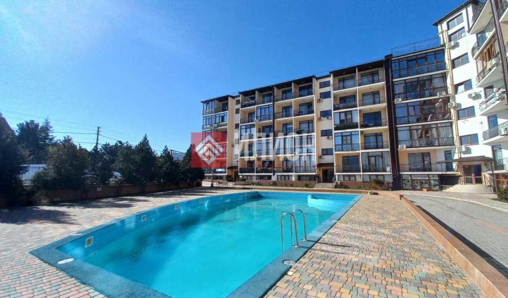 Расположение апартаментов самое удачное в комплексе, окна выходят во двор с бассейном и на море! При этом витражное остекление в комнате и на балконе позволяет любоваться этими видами!