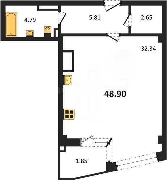 В продаже имеются студио-апартаменты с отделкой в жилом комплексе "Garden" премиум-класса. Общая площадь составляет 48,9 кв.м., при этом жилая зона с кухней занимает 32,18 кв.м. Все окна выходят на одну сторону. В квартире есть лоджия и санузел. Высота потолков достигает 2.7 м.