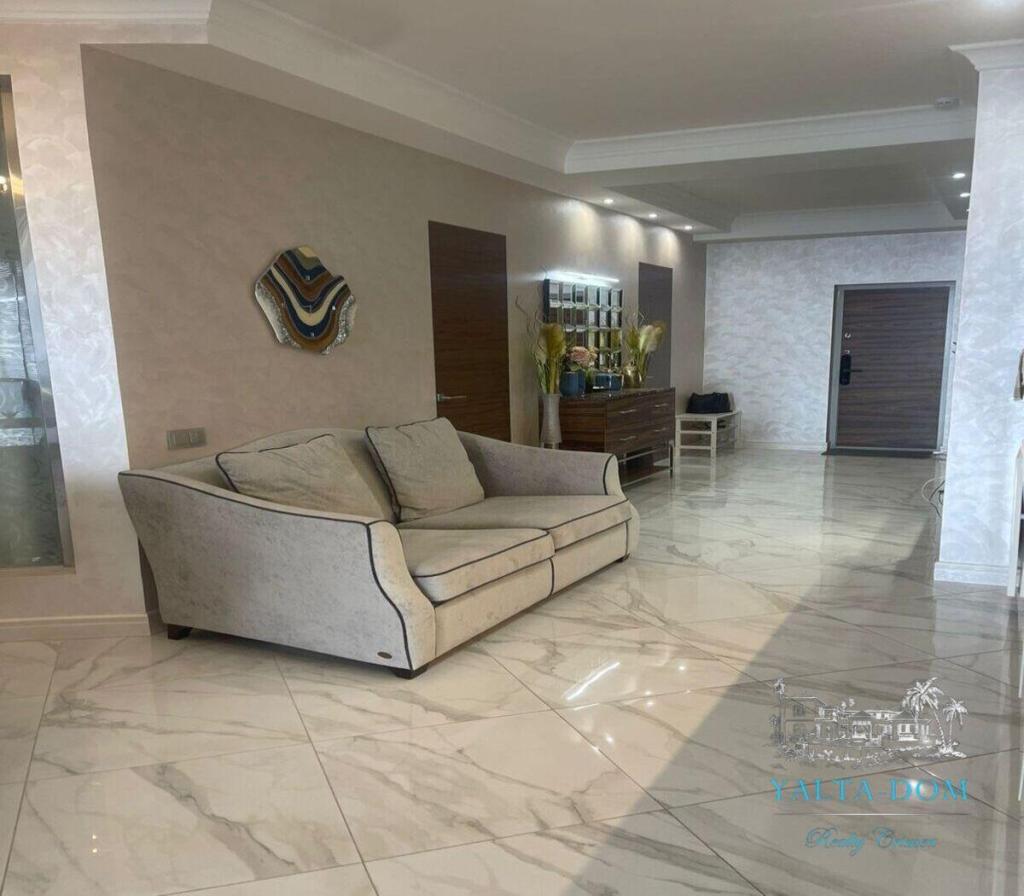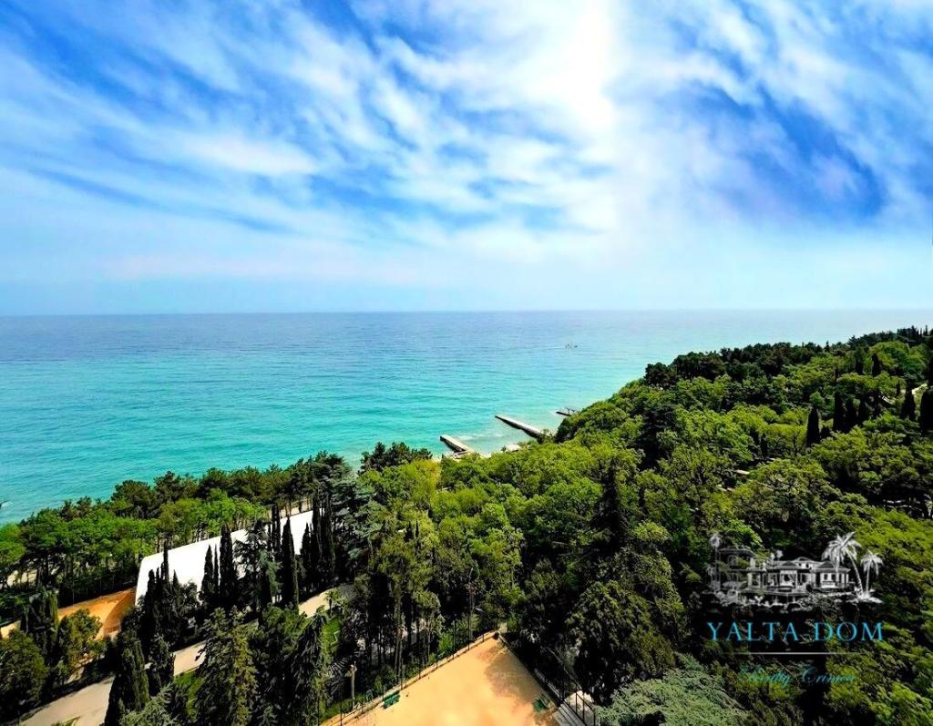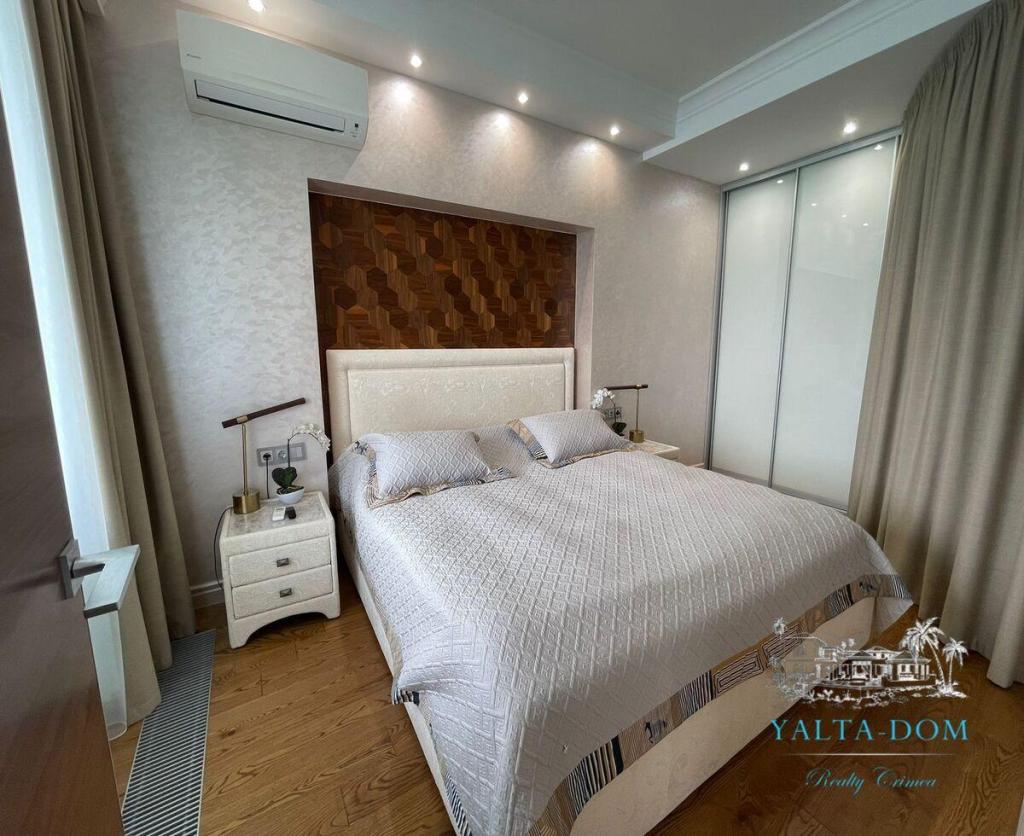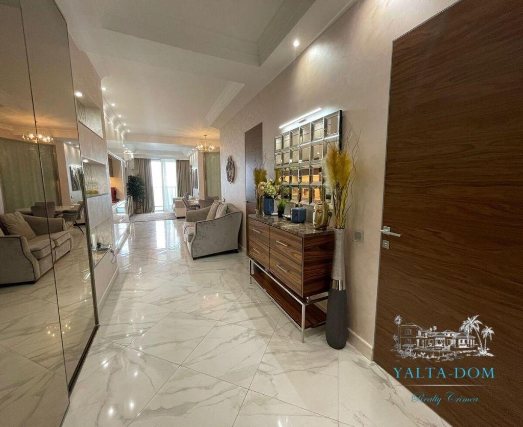 Трехкомнатный апартамент с двумя спальнями, кухней-гостиной и видом на море, общей площадью 86,9м2, расположен в Приморском парке (Ялта), в ЖК Зазеркалье на десятом этаже восемнадцатиэтажного дома.