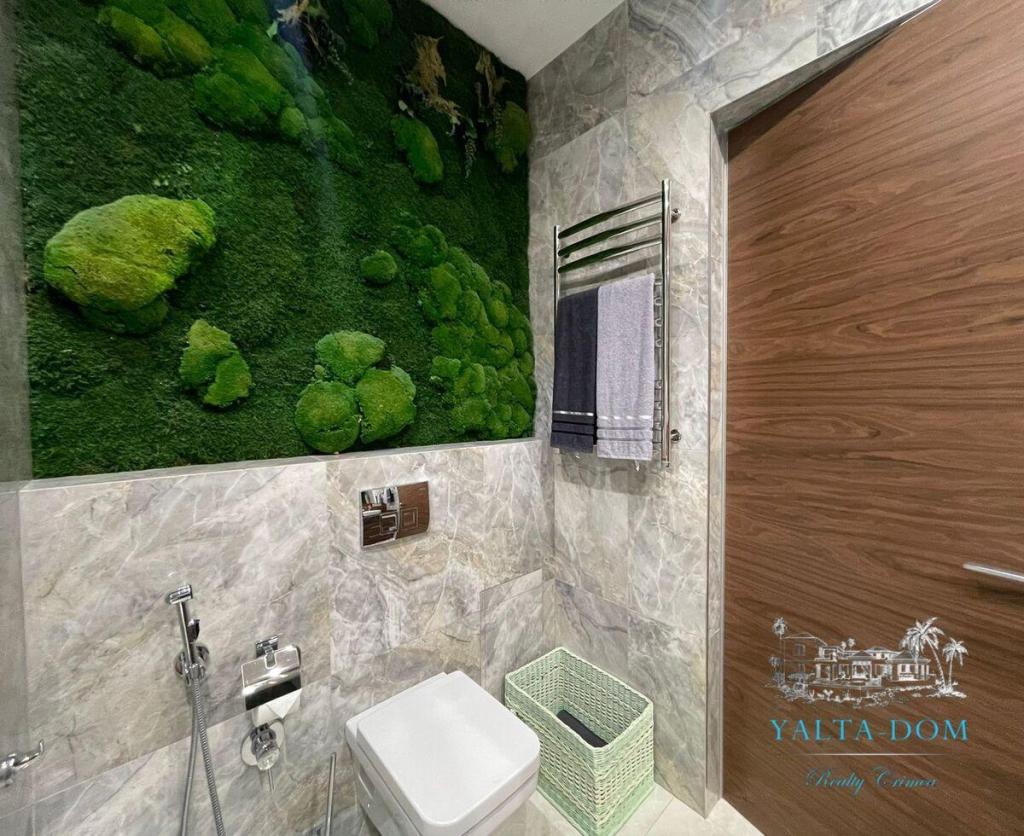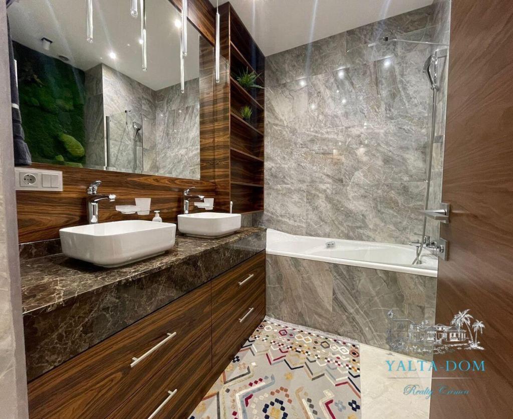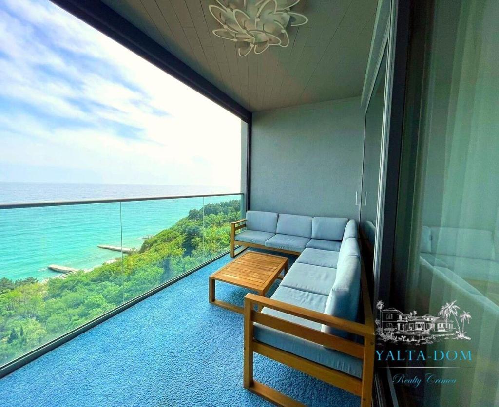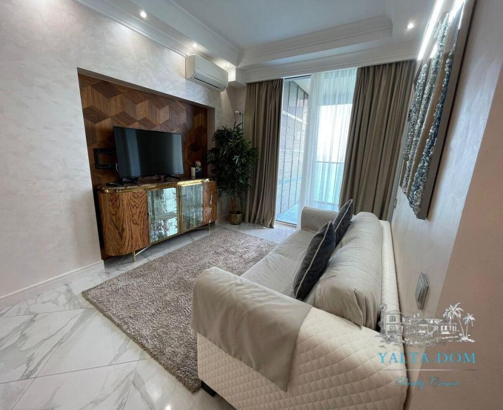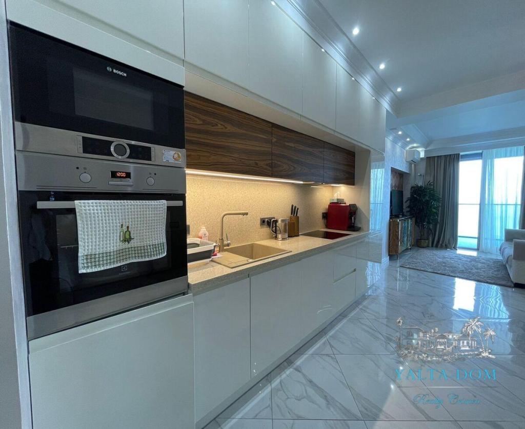 Трехкомнатный апартамент с двумя спальнями, кухней-гостиной и видом на море, общей площадью 86,9м2, расположен в Приморском парке (Ялта), в ЖК Зазеркалье на десятом этаже восемнадцатиэтажного дома.