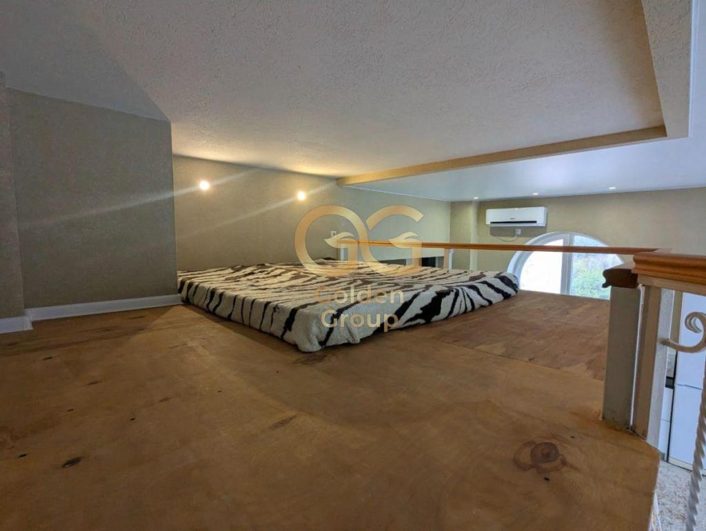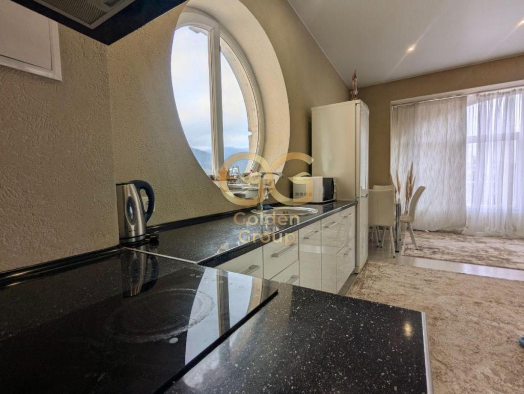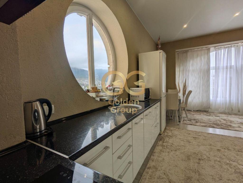 Кухонная зона с уникальным панорамным круглым окном, выходящим на горы, превращает процесс приготовления пищи в настоящее удовольствие. Высокие потолки и второй ярус, где расположено спальное место, добавляют пространству объем и функциональность. В квартире предусмотрено множество мест для хранения вещей, что обеспечивает порядок и комфорт.
